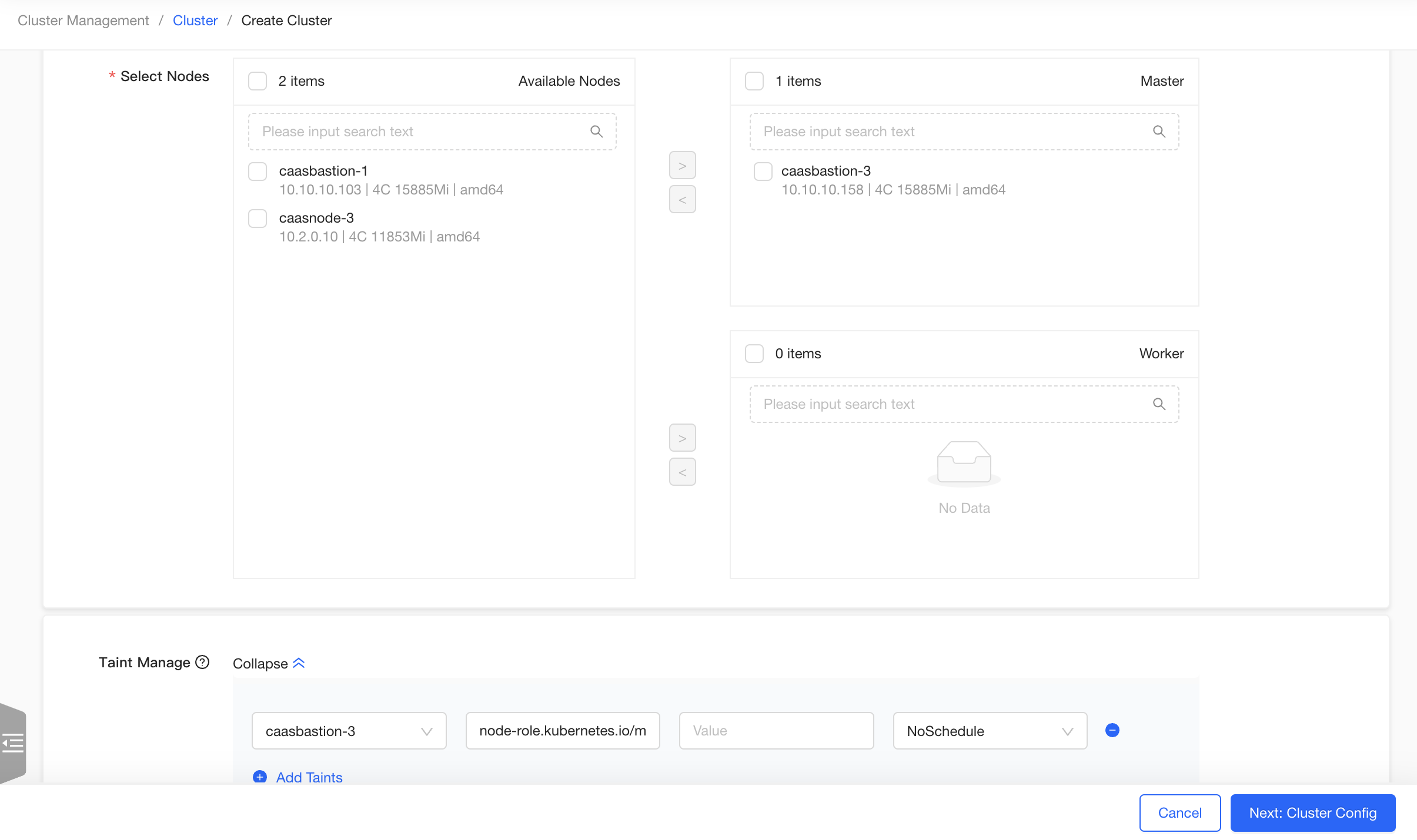 Follow the text prompts to complete the steps of entering the cluster name and selecting nodes