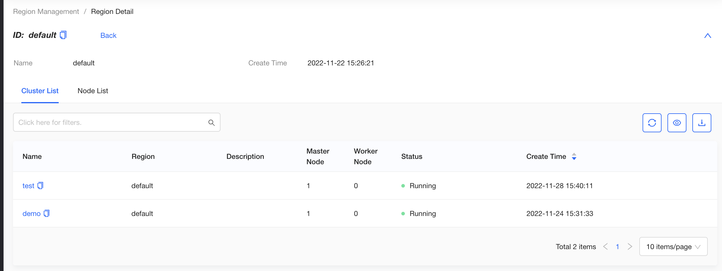 KubeClipper supports multi-region management. That is, all nodes and clusters managed by the platform are divided into physical or logical regions. On the Region Management page, you can view all regions in the platform. Click a region name to enter the region detail page, and you can view the clusters and nodes in the region.